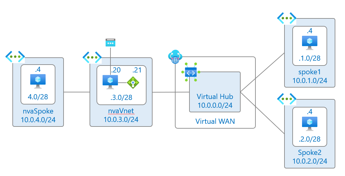 ですが、「Virtual WAN の Azure Firewall や仮想アプライアンスでは使えない機能がある」や「仮想アプライアンスを自分たちで可能な限り管理したい」というような要件がある場合には、スポーク仮想ネットワークに IaaS で自前の仮想アプライアンスを置きたくなることもあるでしょう。そんな構成をやってみましたというエントリーです。